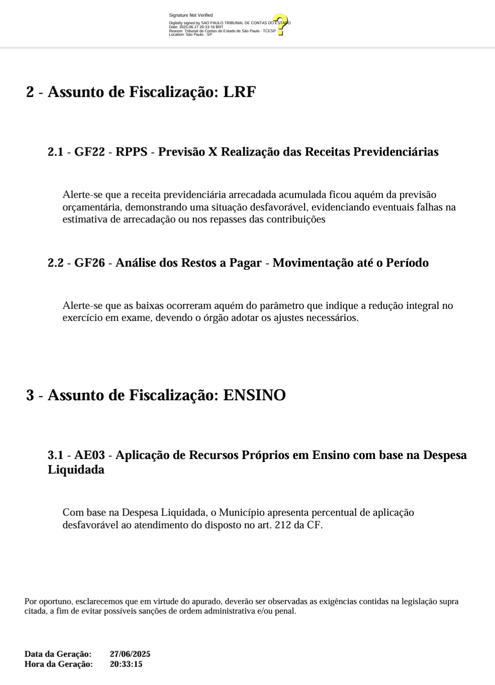 Dos 644 municípios paulistas jurisdicionados pelo Tribunal de Contas do Estado de São Paulo (TCESP), 555 cidades (86%) receberam alertas, conforme disposto na Lei de Responsabilidade Fiscal n.º 101/2000, por apresentarem indícios de irregularidade na gestão orçamentária, arrecadação abaixo do esperado ou gastos excessivos com pessoal.