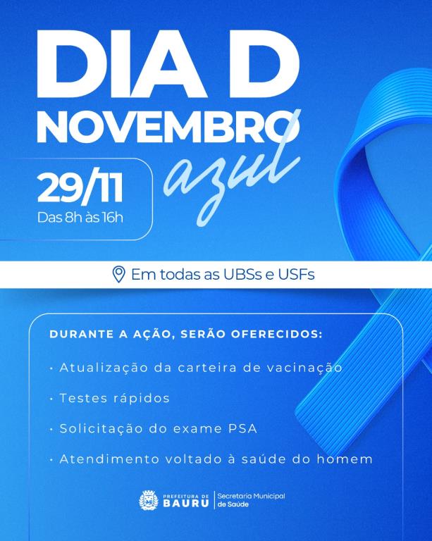 No dia 29 de novembro, sábado, das 8h às 16h, o ‘Dia D’ das ações do Novembro Azul, para a saúde do homem, e da campanha ‘Fique Sabendo’, com o objetivo de ampliar o acesso à testagem rápida para HIV e sífilis, além de reforçar a prevenção, diagnóstico e tratamento dessas condições. Os serviços serão disponibilizados em todas as Unidades Básicas de Saúde (UBS) e Unidades de Saúde da Família (USF).