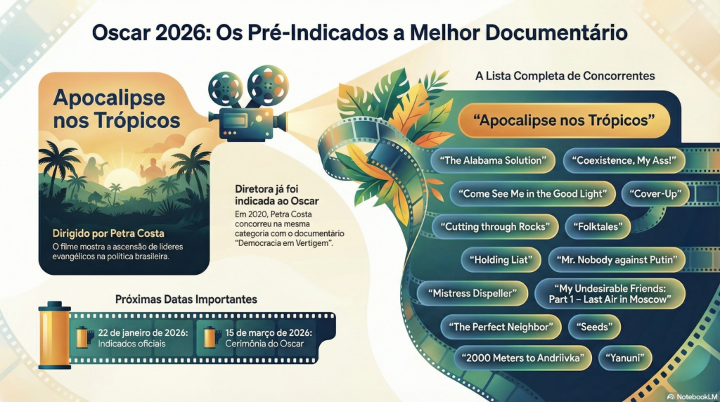 O documentário brasileiro “Apocalipse nos Trópicos,” dirigido por Petra Costa e distribuído pela Netflix, foi incluído na lista de pré-selecionados ao Oscar 2026 na categoria de Melhor Documentário pela A Academia de Artes e Ciências Cinematográficas. A divulgação da pré-lista foi lançada nesta terça-feira (16).