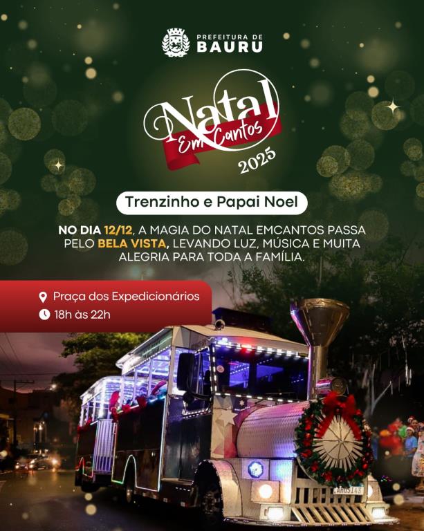 A Prefeitura de Bauru promove nesta sexta-feira (12), às 18h, mais uma apresentação do projeto “Natal EmCantos”, que chega ao Jardim Bela Vista com show do Palhaço Felipito na Praça dos Expedicionários. A programação inclui ainda passeio de trenzinho para as crianças, brinquedos infláveis e a presença do Papai Noel. As atividades são gratuitas.