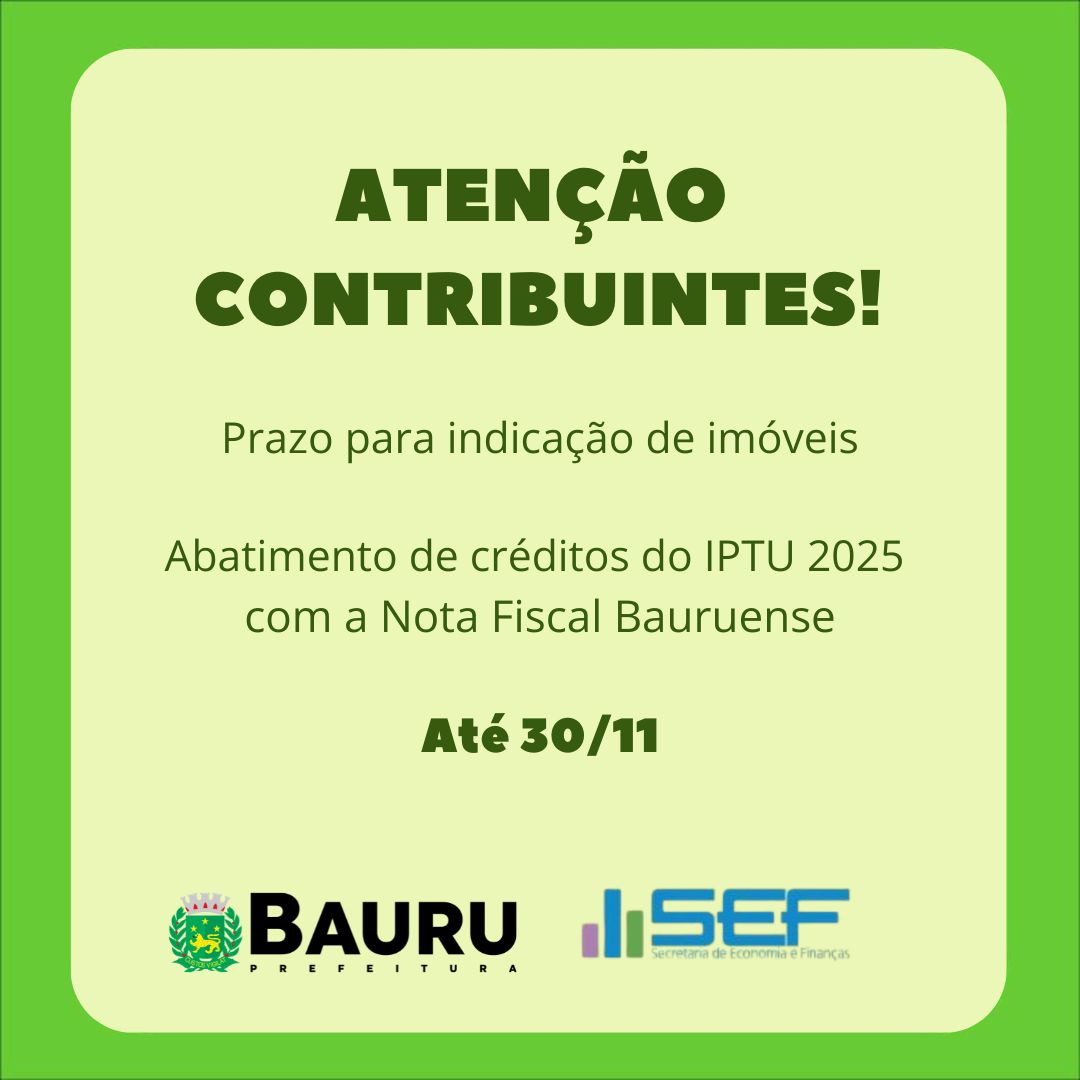 A Prefeitura de Bauru, através da Secretaria de Finanças, informa que os contribuintes, pessoas físicas, tomadores de serviços do Programa Nota Fiscal Bauruense, têm até o dia 30/11 para indicar imóveis edificados localizados no município para abatimento de créditos no IPTU 2025.