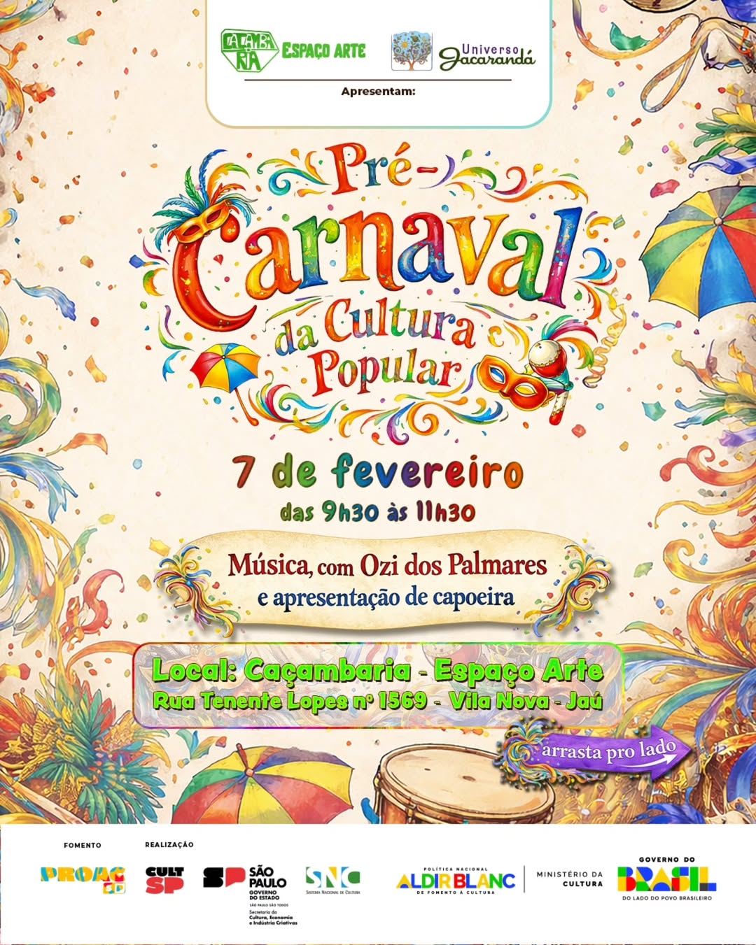 No sábado (07), das 9h30 às 11h30, a Caçambaria Espaço Arte promove o Pré-Carnaval da Cultura Popular por meio do Projeto Universo Jacarandá. O encontro é aberto e gratuito para toda a família, com música, dança, batuque e celebração das tradições brasileiras.