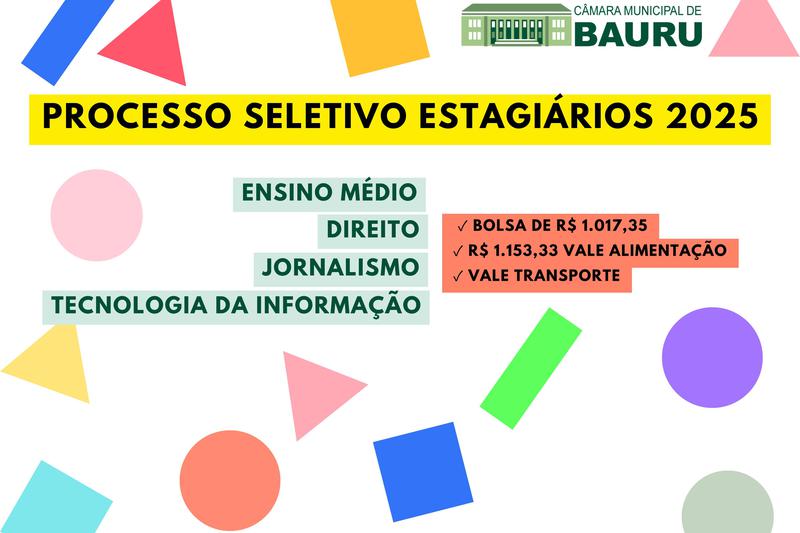 Na próxima segunda-feira (15), começam as inscrições para o Processo Seletivo da Câmara Municipal de Bauru que visa preencher 16 vagas de estágio para estudantes de Ensino Médio e Ensino Superior. As inscrições são gratuitas e devem ser feitas pelo site da Casa de Leis, acessando o Menu Transparência e o item Concursos Públicos.