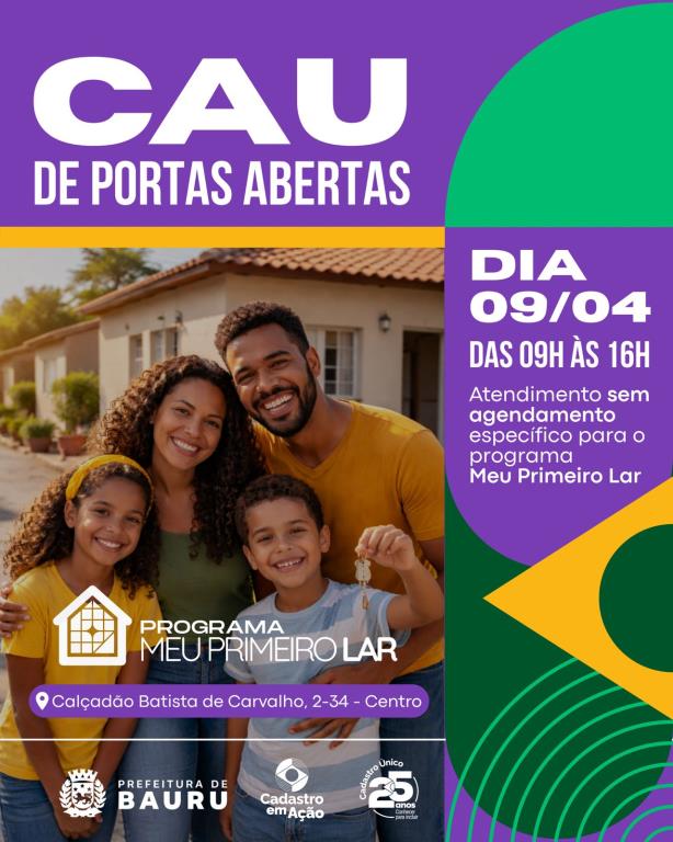 A Secretaria de Assistência Social de Bauru realiza nesta quinta-feira (9), das 9h às 16h, o evento “CAU de Portas Abertas”, voltado à atualização de dados e novas inscrições no Cadastro Único para interessados no programa habitacional “Meu Primeiro Lar”.