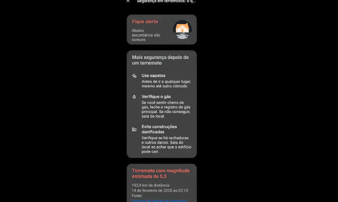 O Sistema de Alertas de Terremoto do Android, que pertence ao Google, emitiu nesta madrugada (14) alerta de terremoto para moradores de São Paulo e do Rio de Janeiro que utilizam o aplicativo em seus celulares. De acordo com o aviso, disparado por volta das 2h20, o suposto terremoto estaria ocorrendo no mar, a cerca de 55 km de Ubatuba, no litoral norte paulista.