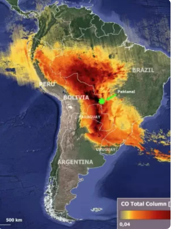As queimadas que atingem o Brasil nos últimos dias deixaram os níveis de monóxido de carbono na atmosfera altíssimos, segundo a MetSul Metereologia. O gás está cobrindo principalmente o Sul da região Amazônica, o Centro-Oeste, o Sul do país e São Paulo.