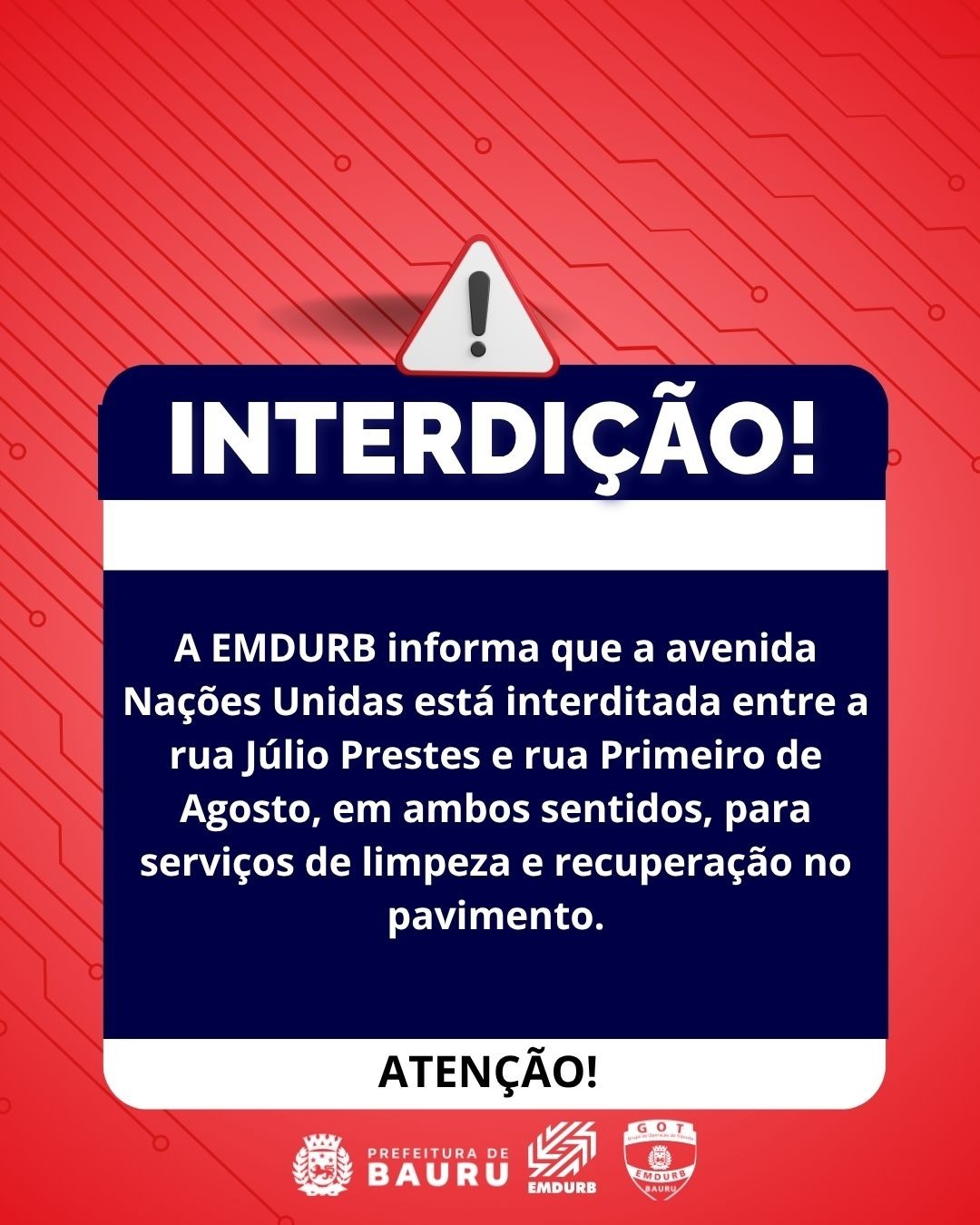 A EMDURB comunica a interdição da avenida Nações Unidas, em ambos os sentidos, no trecho entre a rua Júlio Prestes e a rua Primeiro de Agosto.