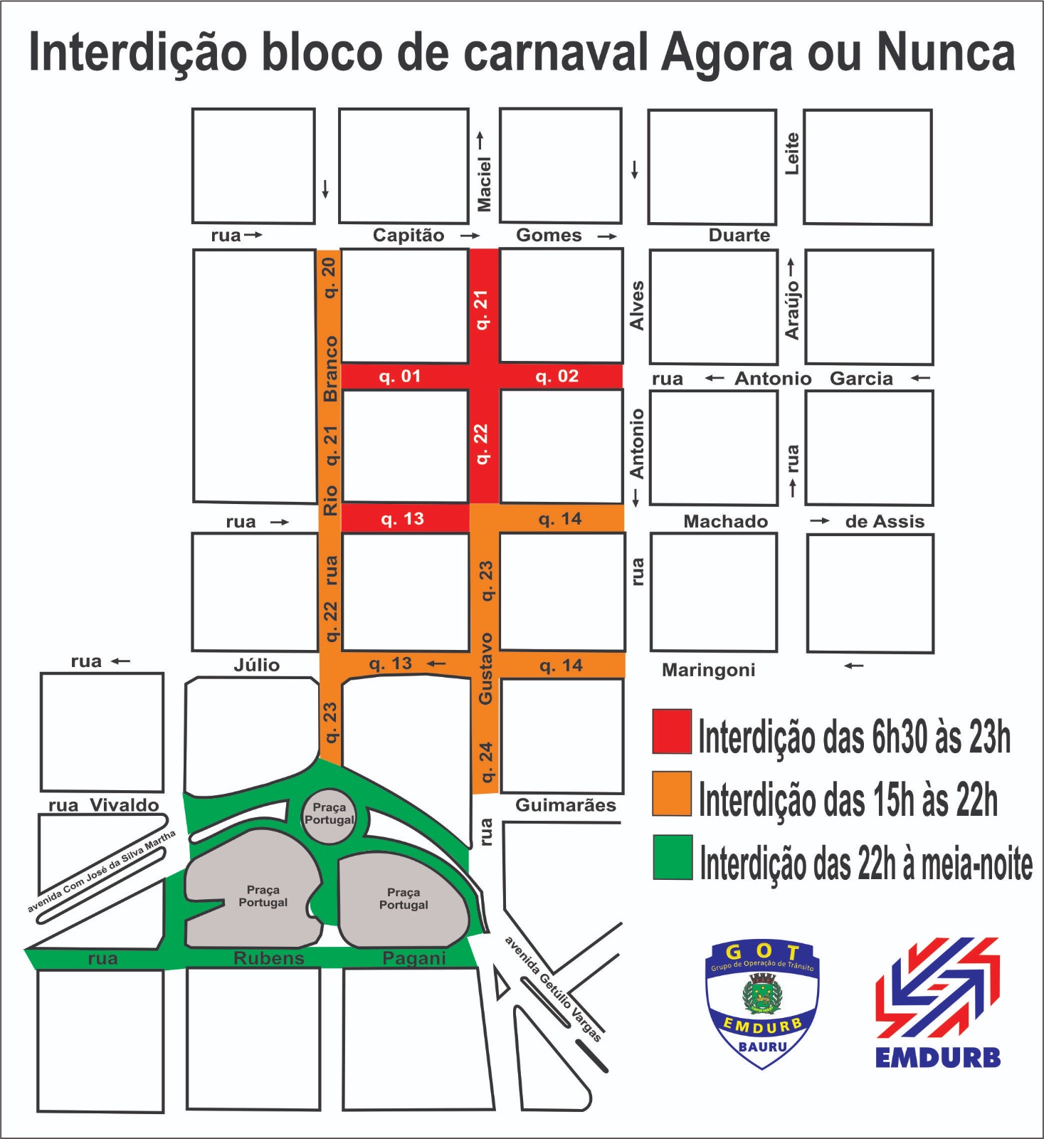 No sábado (7), em virtude da realização do carnaval do bloco “Agora ou Nunca”, a EMDURB informa as seguintes interdições: