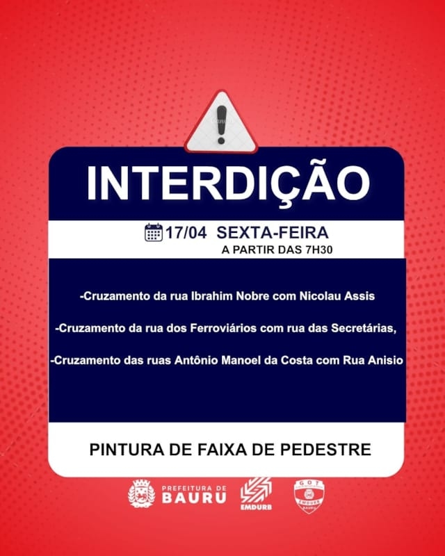 A Diretoria de Sistema Viário e Transportes da EMDURB, por meio do GOT, informa as seguintes interdições para sexta-feira (17):