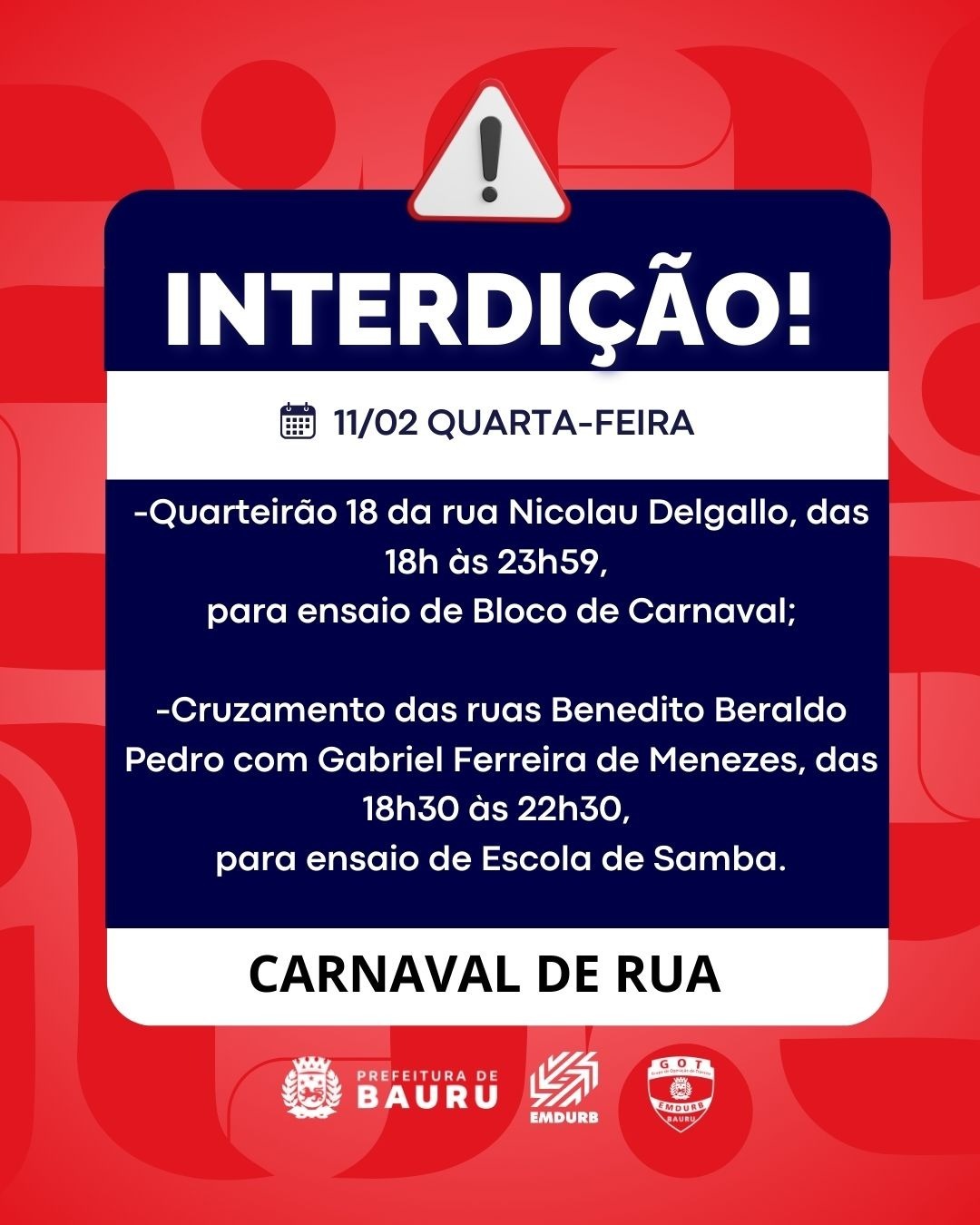 • -Quarteirão 18 da rua Nicolau Delgallo, das 18h às 23h59, para ensaio de Bloco de Carnaval;