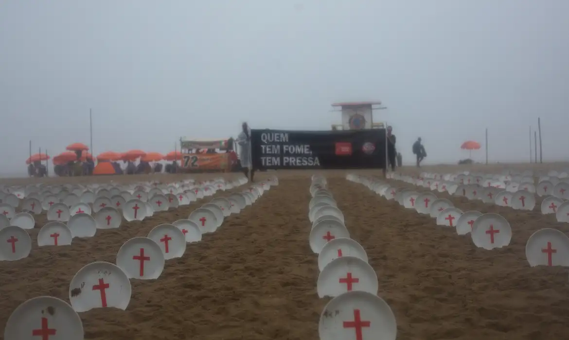 Quem passou pela Praia de Copacabana na manhã deste sábado (16) se deparou com mais de 700 pratos vazios fincados na areia. O ato que pedia o fim da fome no mundo foi uma das duas manifestações realizadas na orla da praia mais famosa do Rio de Janeiro, às vésperas da reunião de cúpula do G20, grupo formado pelas maiores economias do planeta mais a União Europeia e a União Africana.