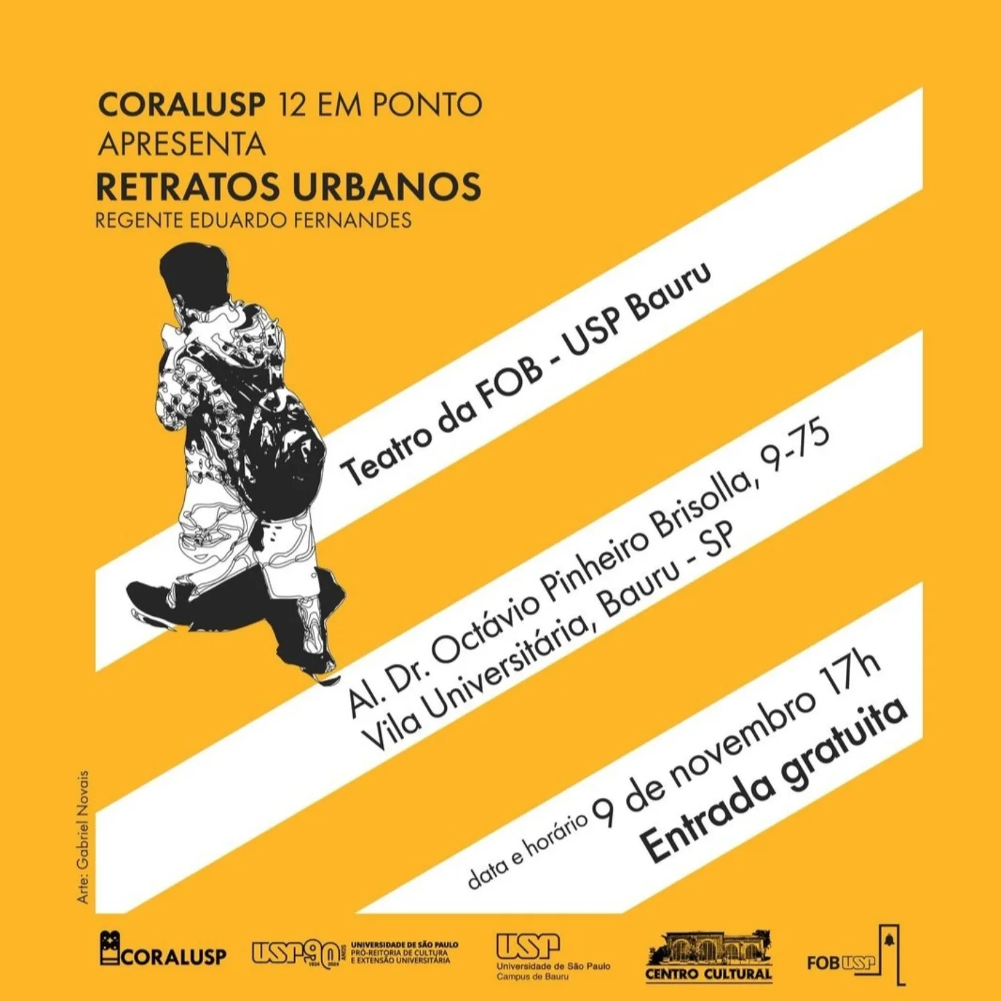 Neste sábado (9), a partir das 17 horas, o CORALUSP 12 em Ponto apresenta o concerto Retratos Urbanos no Teatro da Faculdade de Odontologia de Bauru (FOB). O espetáculo é aberto ao público com entrada gratuita.