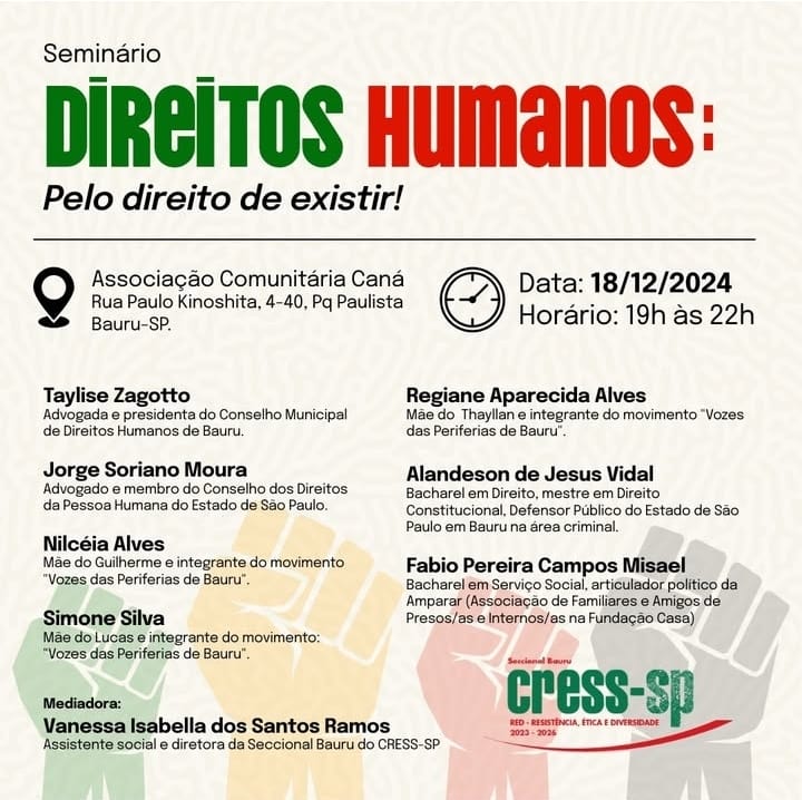 Nesta quarta-feira (18), o Conselho Regional de Serviço Social (CRESS SP) e o Conselho Municipal de Direitos Humanos de Bauru promovem o seminário “Direitos Humanos: pelo direito de existir!”.