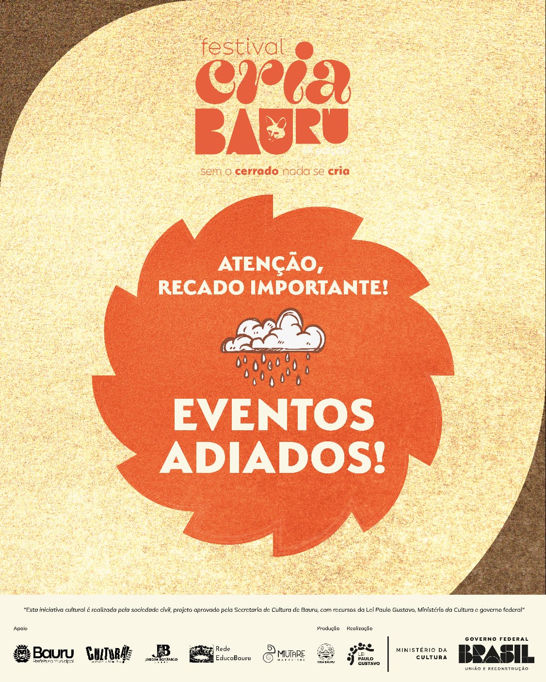 A organização do Festival Cria Bauru emitiu nota no qual informa que, “por conta da chuva e tempo instável deste fim de semana, alguns eventos em espaços abertos tiveram suas datas adiadas (alguns ainda sem definição de dia), os locais continuam os mesmos”.