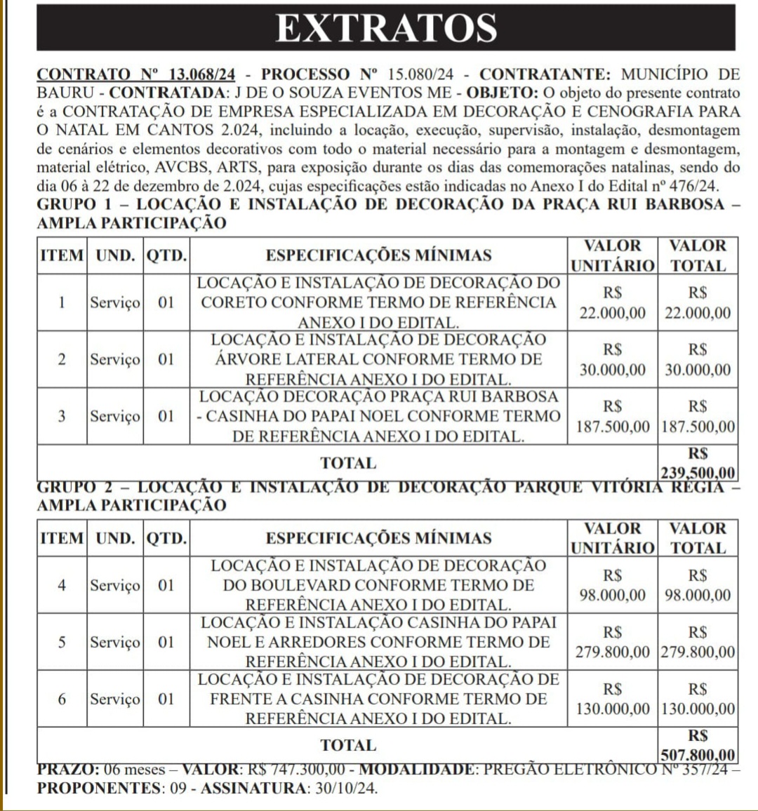 A Prefeitura de Bauru publicou no Diário Oficial do Município o Extrato do Contrato firmado com a empresa “J de O Souza ME”, vencedora do processo licitatório para realizar a decoração do Natal Em Cantos deste ano.