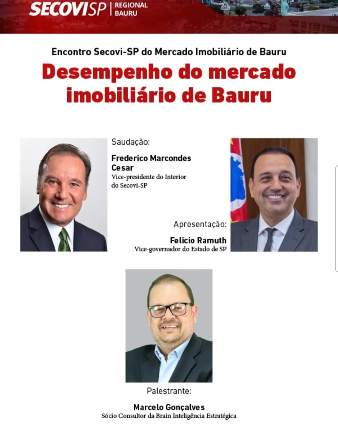 O encontro contará com as presenças do vice-presidente do Interior do Secovi-SP, Frederico Marcondes Cesar; com o vice-governador Felício Ramuth (PSD); com o palestrante Marcelo Gonçalves, que é sócio consultor da Brain Inteligência Estratégica; e com o anfitrião Bruno Pegorin Netto, diretor regional da Regional Secovi-SP em Bauru.