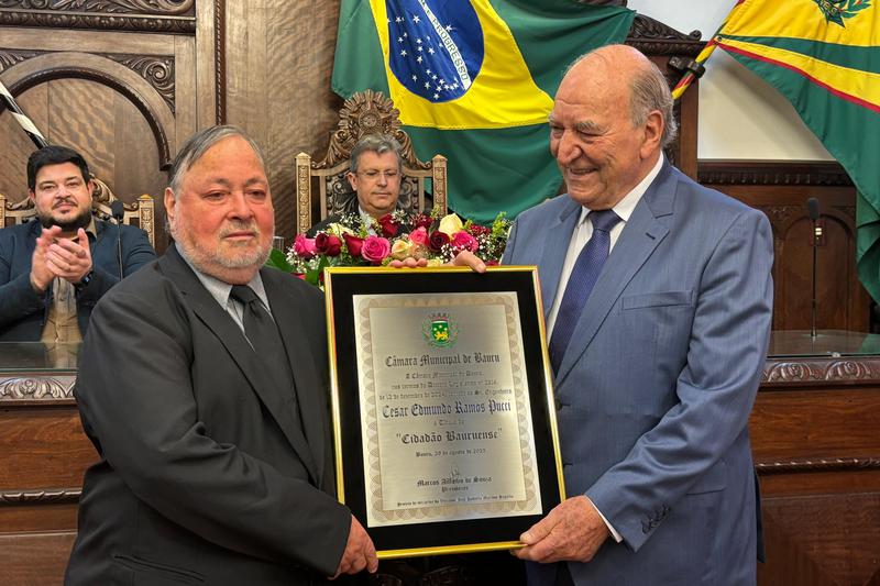 Na noite desta sexta-feira (29), a Câmara de Bauru realizou uma solenidade para a entrega do Título de Cidadão Bauruense ao engenheiro Cesar Edmundo Ramos Pucci. A homenagem, proposta pelo vereador José Roberto Segalla (União Brasil), foi aprovada por unanimidade pela Casa de Leis.