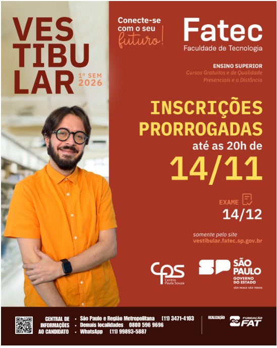 Para mais informações, acesse o site da Fatec ou ligue no telefone (14) 3236-9350.
