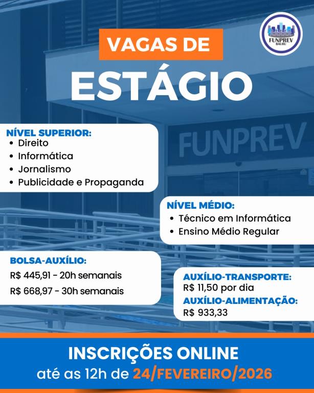 A Fundação de Previdência dos Servidores Públicos Municipais Efetivos de Bauru (Funprev) e o Centro de Integração Empresa Escola (CIEE) abrem hoje (8) as inscrições de processo seletivo para vagas de estágio. O processo destina-se ao preenchimento de vagas para os alunos do ensino médio e superior.