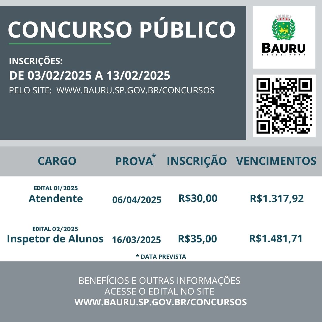 A Prefeitura de Bauru, por meio da Secretaria da Administração, vai abrir inscrições de dois concursos públicos em fevereiro, para os cargos de atendente (edital 01/2025) e inspetor de alunos (edital 02/2025), conforme informações a seguir.