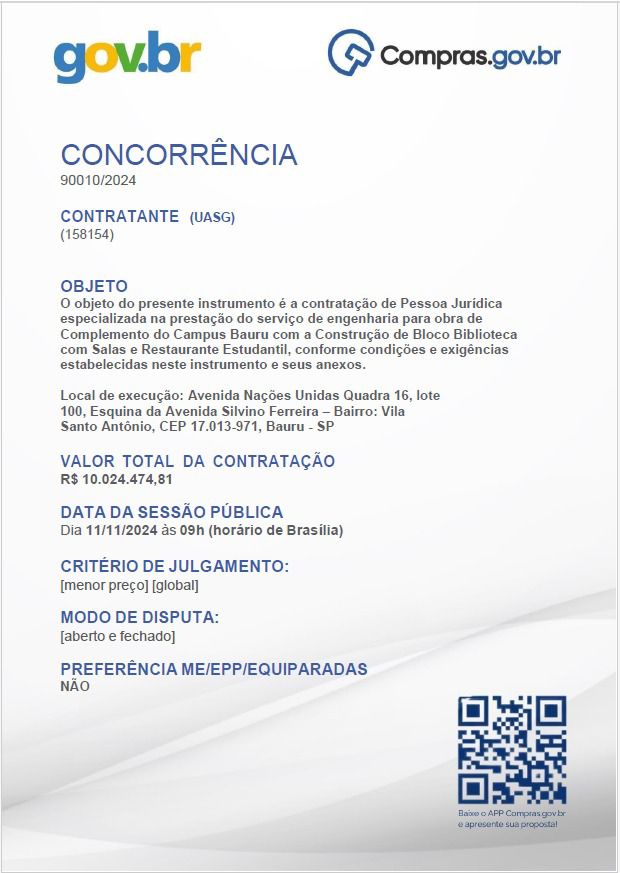 De acordo com o novo processo licitatório, a empresa vencedora será responsável pela construção de uma Biblioteca com Salas e um Restaurante Estudantil, cujas obras estão orçadas em cerca de R$ 10 milhões.