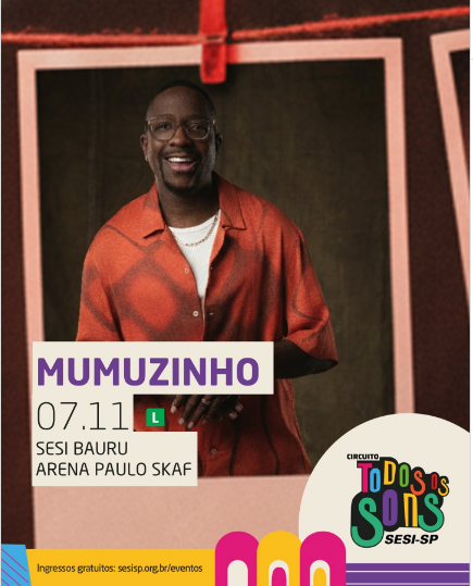No dia 7 de novembro, sexta-feira, o cantor Mumuzinho sobe ao palco da Arena Paulo Skaf, em Bauru, com o repertório que celebra o samba com uma sonoridade contemporânea.