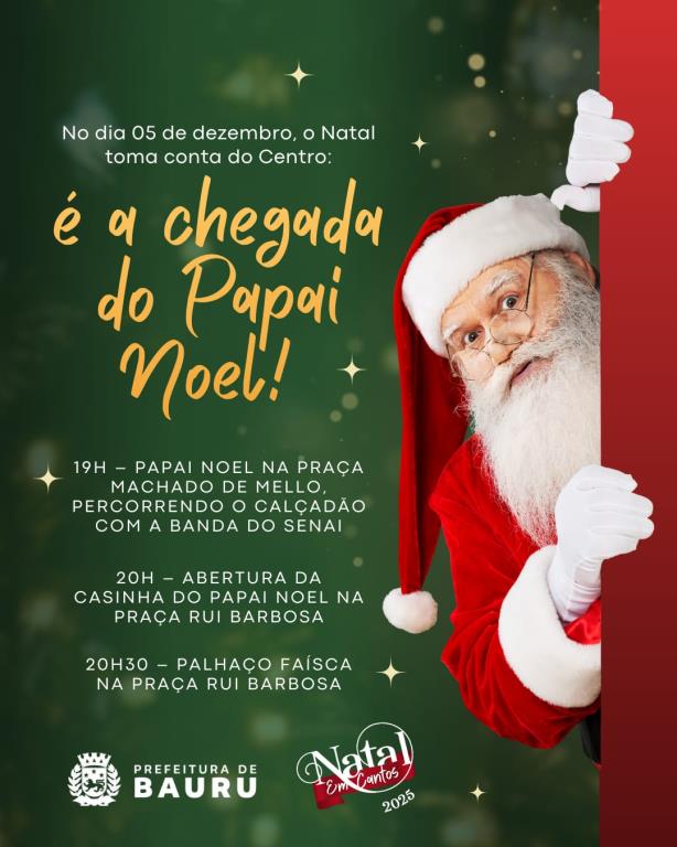 Nesta sexta-feira (5), a programação da 4ª edição do “Natal EmCantos” traz a chegada do Papai Noel às 19h na Praça Machado de Mello, seguida de um percurso pelo Calçadão com a Banda do Senai. Às 20h, acontece a abertura da casinha na Praça Rui Barbosa, com apresentação do Palhaço Faísca e distribuição de brindes para as crianças.