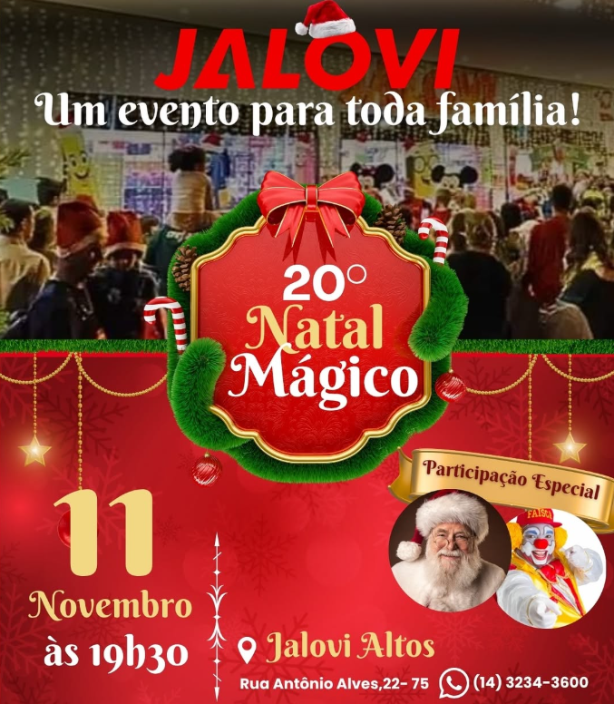 A 20ª edição do Natal Mágico da Jalovi começa nesta terça-feira (11). A partir das 19h30, na unidade Jalovi Altos, a população poderá prestigiar a decoração natalina, a cascata de fogos, e claro, a chegada do Papai Noel.