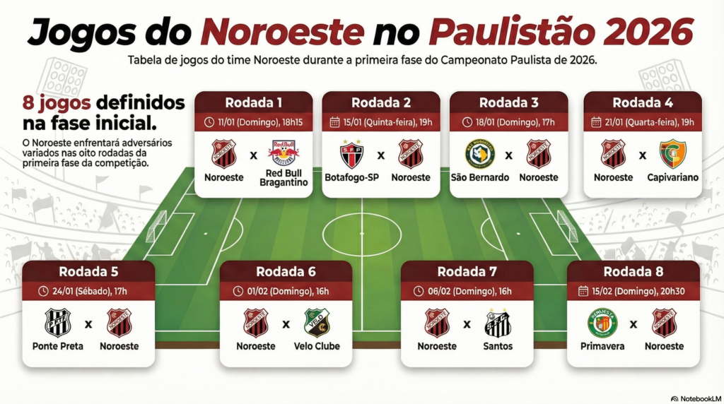 A Federação Paulista de Futebol anunciou oficialmente os horários, datas, locais e transmissões de todos os jogos do Paulistão 2026, e o Noroeste já sabe seus jogos da primeira fase da competição.