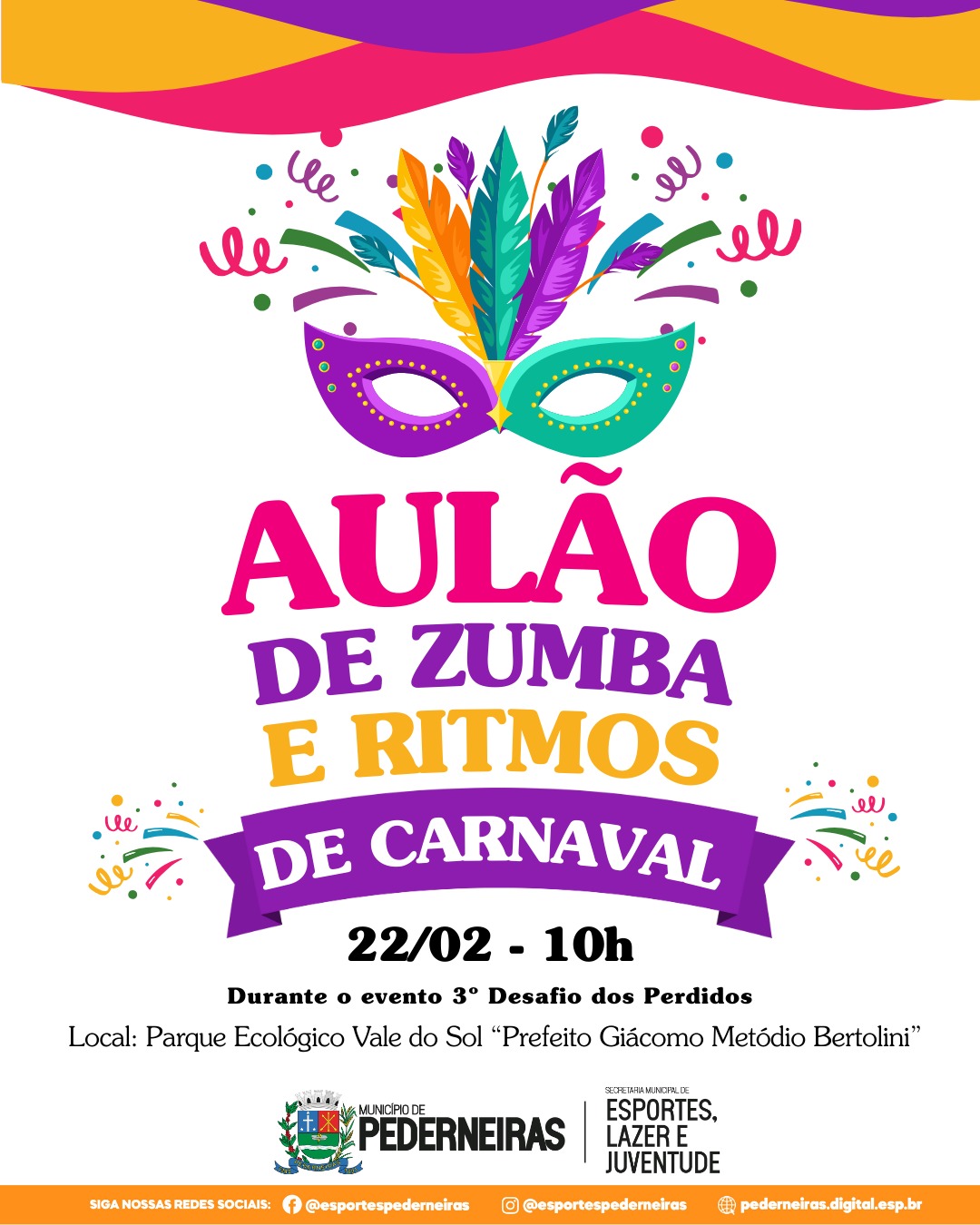 Neste domingo, dia 22 de fevereiro, a Prefeitura de Pederneiras, por meio da Secretaria Municipal de Esportes, Lazer e Juventude, promove um Aulão Aberto de Zumba e Ritmos de Carnaval, às 10h, no Parque Ecológico Vale do Sol “Giácomo Metódio Bertolini”.