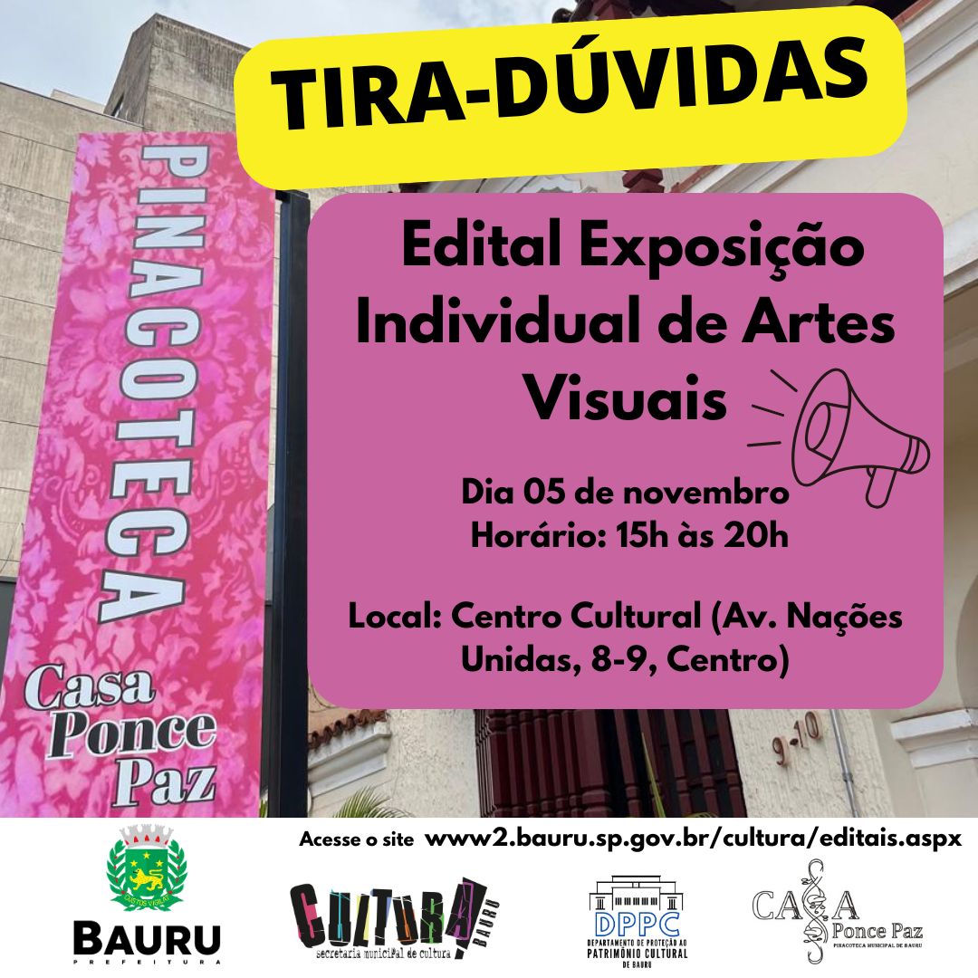 Será realizado um plantão tira-dúvidas sobre o edital para Exposição Individual de Artes Visuais, nesta terça-feira (5), das 15h às 20h. O atendimento será presencial, no Centro Cultural ‘Carlos Fernandes de Paiva’, na avenida Nações Unidas, 8-9, no Centro.