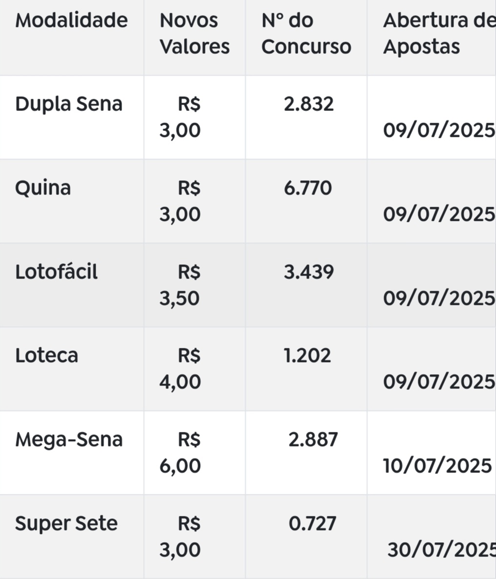 As apostas das Loterias Caixa aumentam a partir de 9 de julho. O reajuste atinge as modalidades Dupla Sena, Quina, Lotofácil, Mega-Sena, Loteca e Super Sete.