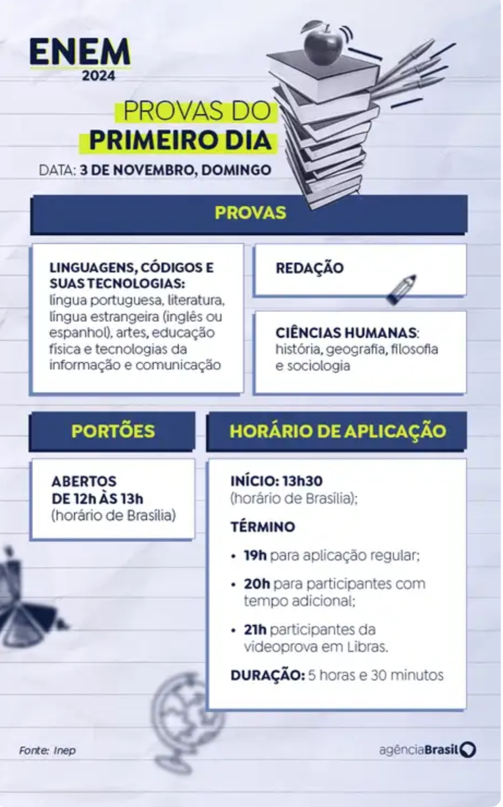 A aplicação da primeira etapa do Exame Nacional do Ensino Médio (Enem) de 2024 será realizada neste domingo (3), a partir de 13h30, em todos os estados, mais o Distrito Federal, em 1753 municípios.![]()