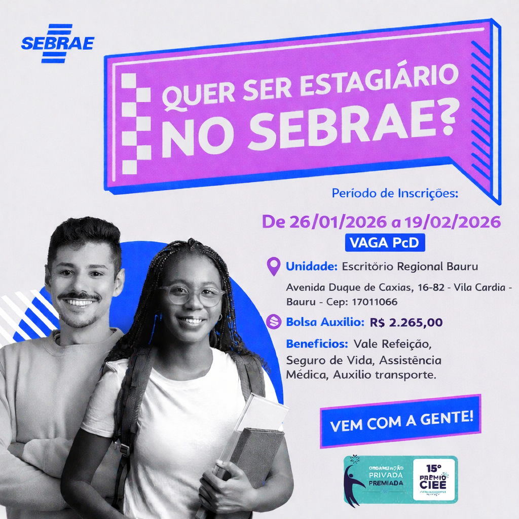 O Sebrae-SP prorrogou as inscrições para a vaga de estágio exclusiva para pessoas com deficiência (PcD) com atuação presencial no Escritório Regional de Bauru. A oportunidade é voltada a estudantes de graduação, com carga horária de 30 horas semanais e bolsa-auxílio de R$ 2.266,00, além de benefícios como vale-refeição, auxílio-transporte, assistência médica e seguro de vida.
