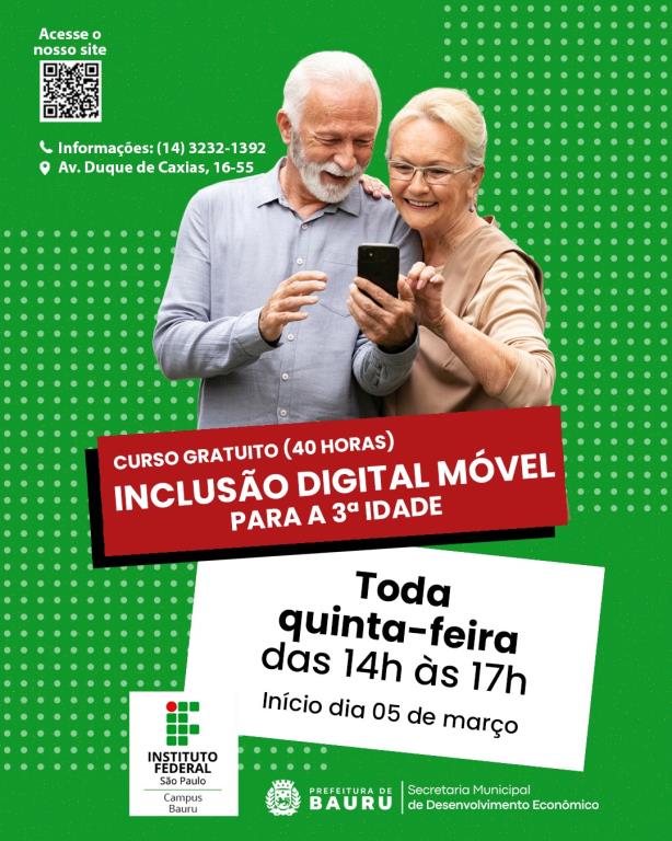 A Secretaria de Desenvolvimento Econômico, Turismo e Inovação (Sedecon) e seu Centro de Inovação Tecnológica (CIT), firmaram uma parceria com o Instituto Federal de Educação, Ciência e Tecnologia de São Paulo (IFSP) – Campus Bauru. O objetivo é oferecer um curso gratuito de inclusão digital móvel, especificamente voltado para a terceira idade.