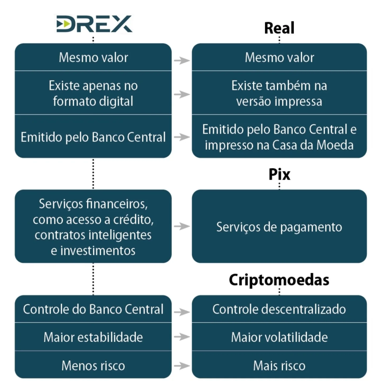 A moeda terá o mesmo valor do real tradicional, será regulada pelo Banco Central (BC) e será emitida apenas na plataforma do Drex. A nova moeda, segundo a explicação do BC, vai permitir vários tipos de transações financeiras seguras com ativos digitais. Esses serviços financeiros inteligentes serão liquidados pelos bancos dentro da plataforma do Drex. Para ter acesso à plataforma, o cidadão precisará de um intermediário financeiro autorizado, como um banco, que fará a transferência do dinheiro depositado em conta para a carteira digital.