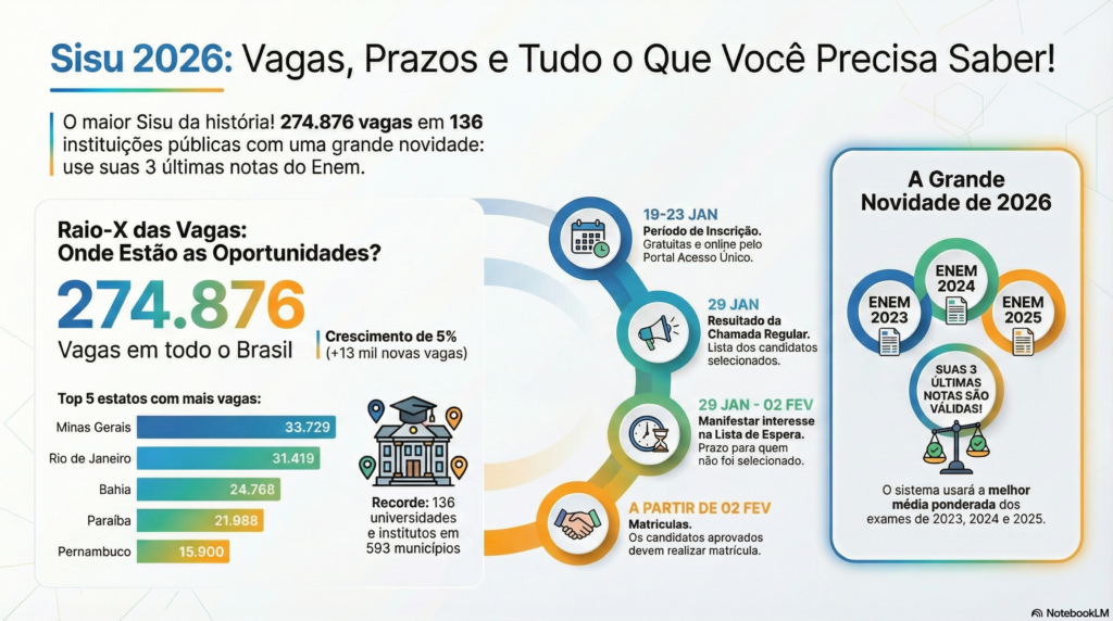 A edição de 2026 do Sistema de Seleção Unificada (Sisu) será a maior da história, oferecendo um total de 274.876 vagas em instituições públicas de ensino superior em todo o Brasil. Dentro desse cenário de expansão, o estado de São Paulo se destaca como um dos principais polos de oferta, com 14.786 vagas disponíveis para os candidatos, ocupando a sexta posição no ranking nacional de oportunidades por unidade da Federação.