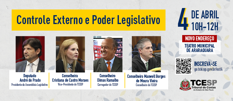 O evento “Controle Externo e Poder Legislativo”, marcado para as 10h, no Teatro Municipal de Araraquara (Av. Bento de Abreu, s/nº – Centro, Araraquara), contará com a presença do Deputado Estadual André do Prado, Presidente da Assembleia Legislativa do Estado de São Paulo (Alesp).