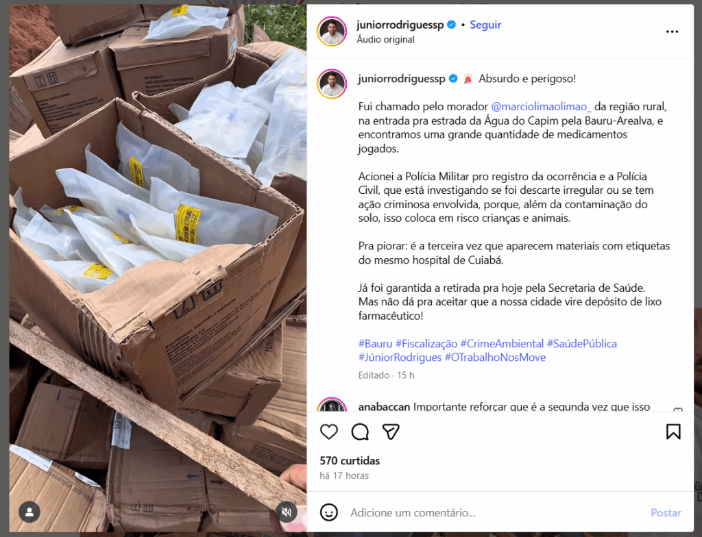 No domingo (09), o vereador Júnior Rodrigues (PSD) foi chamado por um morador da região rural de Bauru, próximo a entrada da estrada Água do Capim,  para averiguar o descarte irregular de medicamentos de um hospital de Cuiabá (MT).