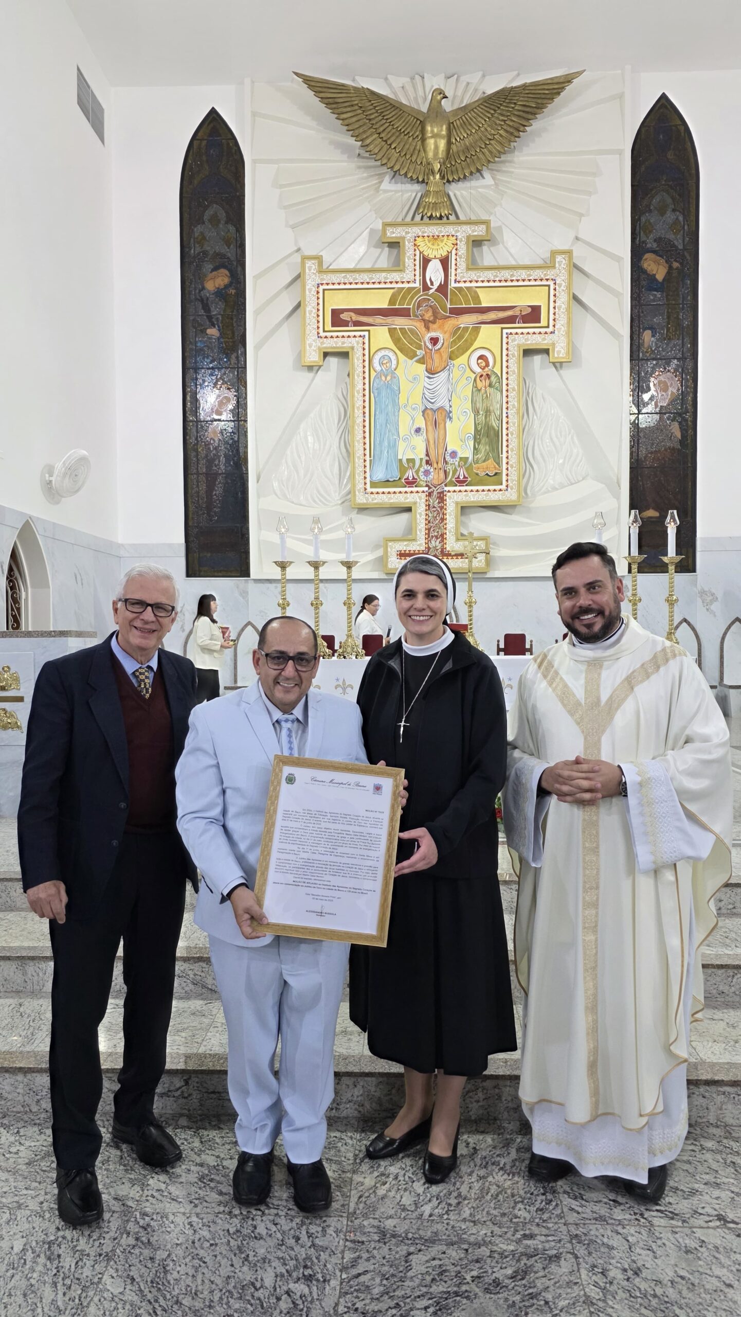 Sandro Bussola aproveitou a cerimônia para entregar uma Moção de Aplauso de sua autoria e aprovada por unanimidade pelos 21 vereadores à irmã Fabiana Berganin, Superiora Provincial do Instituto. O vereador estava acompanhado do prefeito em exercício de Bauru, Orlando Costa Dias, e do padre José Ricardo, da Diocese de São João da Boa Vista.